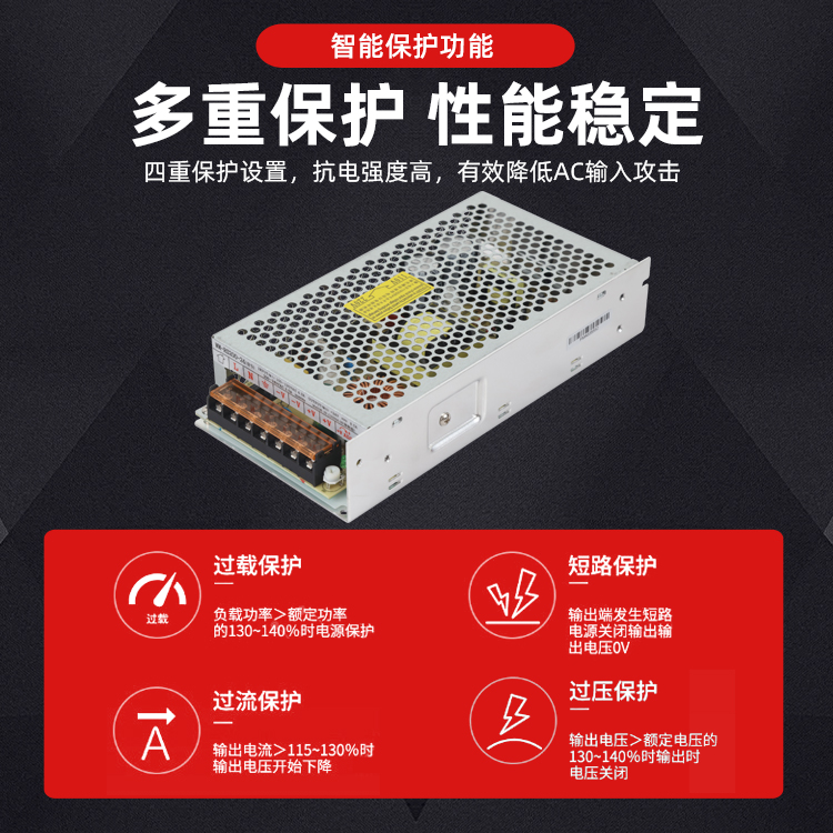 自动化产线:为 PLC、伺服、机器人供电,抗干扰强、MTBF≥12 万小时,停机率降低 80%。数控机床电源 / 激光设备电源:48V 大功率 + 多路隔离输出,瞬态响应快,保障加工精度、切割稳定性。户外 / 冶金 / 矿山:-40℃~+85℃宽温 + 高防护,适应露天、高温、高粉尘环境。新能源电源 / 充电桩电源:宽压输入、高隔离、高效可靠,保障储能、充电设备安全稳定。医疗电源 / 精密检测:低纹波、高隔离、安规认证,守护精密仪器精度与运行安全。