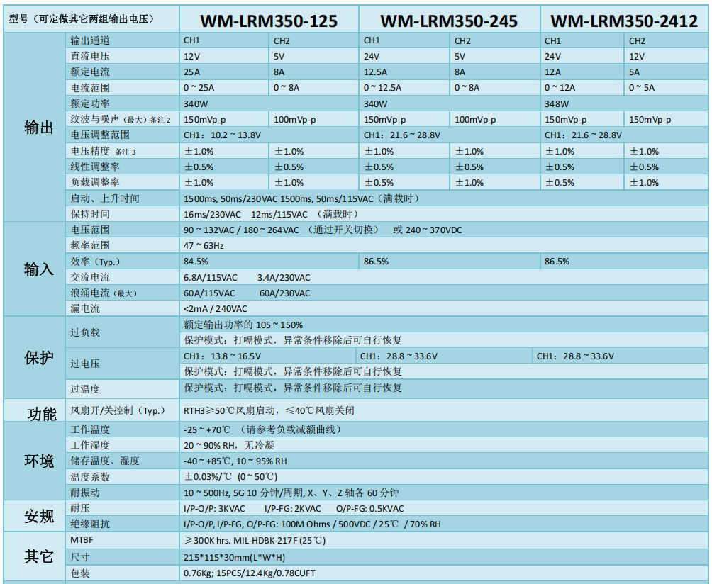 WM-LRM350系列开关电源特性:交流输入范围通过开关切换,可承受300VAC浪涌输入5秒,保护种类:短路/过负载/过电压/过温度,内置直流风扇强制风冷,具有冷却风扇开/关控制,1U低外型,可承受5G振动测试,100%满载老化测试,双组稳压输出,LED 电源指示,工作温度可达70℃,高效率,高寿命和高可靠度,3年保固。
