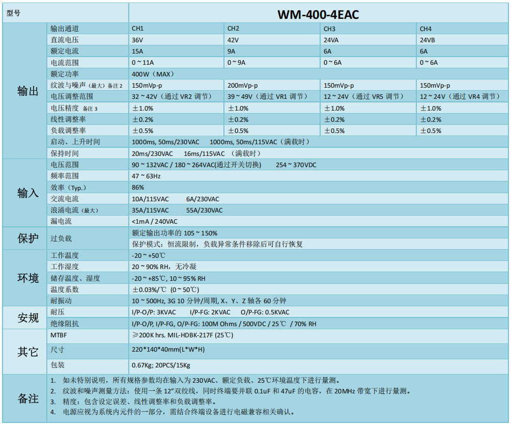 1. 如未特别说明,所有规格参数均在输入为 230VAC、额定负载、25℃环境温度下进行量测。