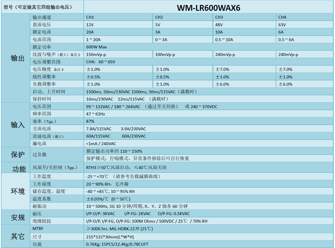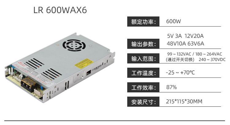 娃娃机电源WM-LR600WA系列特性:高品质,低价格,高效率,低温升,交流输入范围通过开关切换,可承受 300VAC 浪涌输入 5 秒,保护种类:短路/过负载,内置直流风扇强制风冷,具有冷却风扇开/关控制,1U 低外型,可承受 5G 振动测试,100%满载老化测试,CH1&CH2 双组稳压输出,LED 电源指示,工作温度可达 70℃,高效率,高寿命和高可靠度,3 年保固