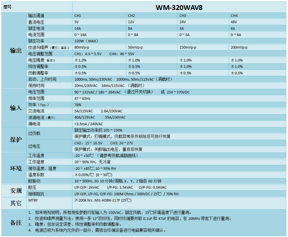 1.如未特别说明,所有规格参数均在输入为230VAC、额定负载、25℃环境温度下进行量测。